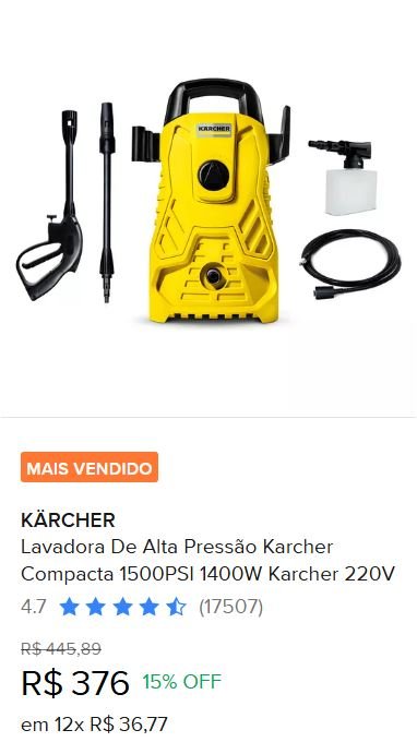A Karcher Compacta, com pressão de 1.500 psi, ajuda na remoção das sujeiras mais difíceis da sua bike, carro, casa, quintal, garagem, e muito mais. A Lavadora de Alta Pressão Karcher Compacta acompanha uma Lança de Jato Reto regulável que se adequa ao tipo de limpeza necessária, e um aplicador de detergente que torna a remoção da sujeira ainda mais simples. Tudo isso com economia de tempo e água, ao comparar com o uso de uma mangueira de jardim convencional.